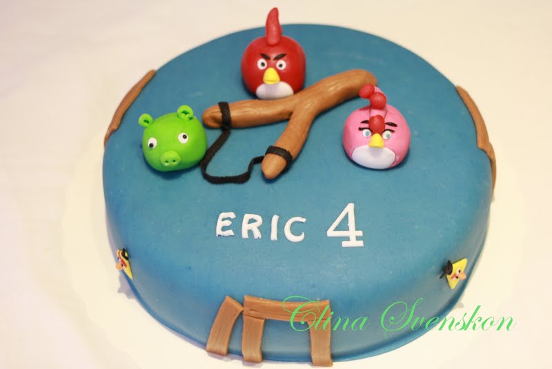 Emmas storebror Eric firade sin 4-årsdag med en Angry Birdstårta. Tårtan består av en ljus sockerkaksbotten fylld med hallonmousse och chokladmousse gjord på geisha. Den är spacklad med creamcheese-frosting och täckt med marsipan. Dekorationerna är gjorda i både marsipan och sp.